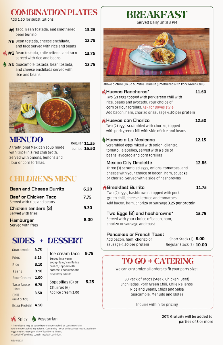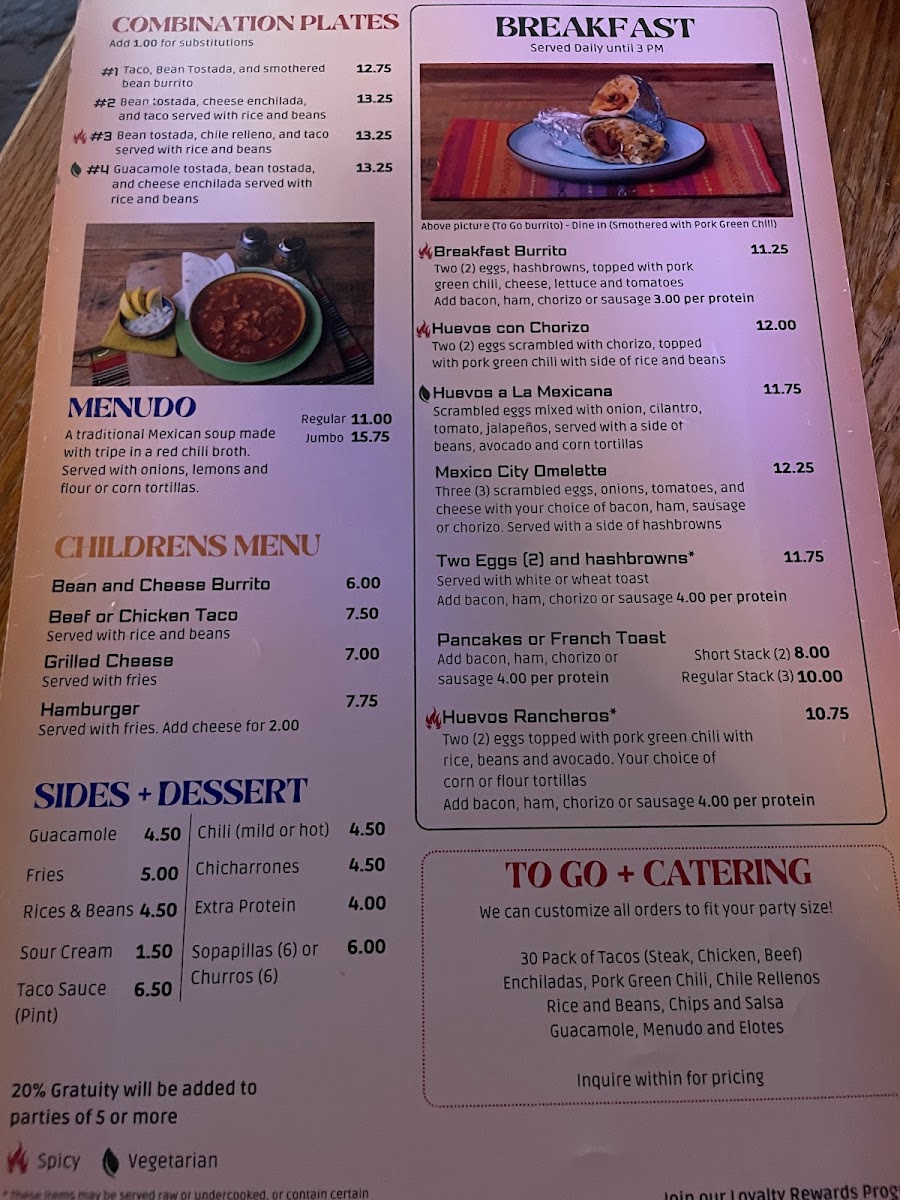 Served with mild or hot pork green chile, rice, beans, corn or flour tortillas and sliced avocado