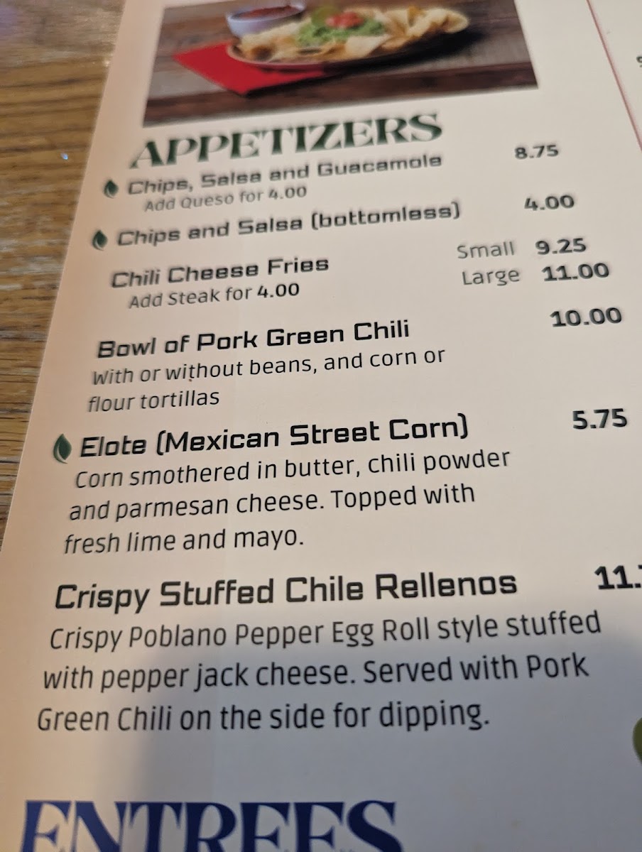 Two (2) crispy rellenos smothered with pork green chile and served with rice and beans